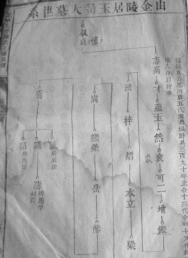 吊图题为“由金陵居玉笥大墓世系”,意思是叔慎由金陵来到玉笥大墓(大墓,又名王墓),世次为:叔慎→志高→才→蕴玉→然→衮→可二→增→鑑→渣→梓→焰→本立→梁→嵩→继荣→岳→濬→乔→诚(徙瓜源)、议(徙林城)、诏(留守大墓)。并在右边有一按语云:“按叔慎公历隋唐五代至乔祖时共三百九十年,止合十三代,今列十八代,疑后人增入,存以待参。”从按语知,修谱者认为传十三代为合适,谱载十八代,不知所出,“存以待参”。马埠陈风章(峡江二中老师)说:衮、可二的后人在新淦,有很多。于是,又赶到新淦县。